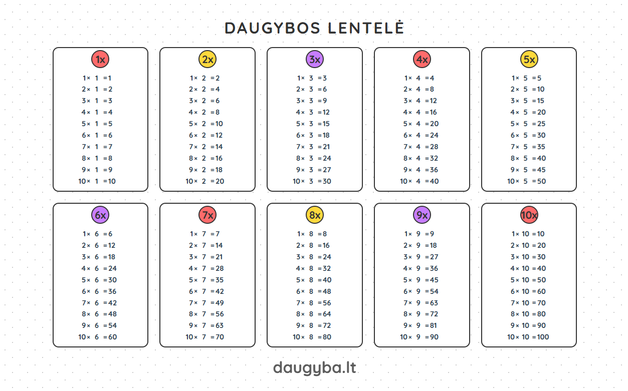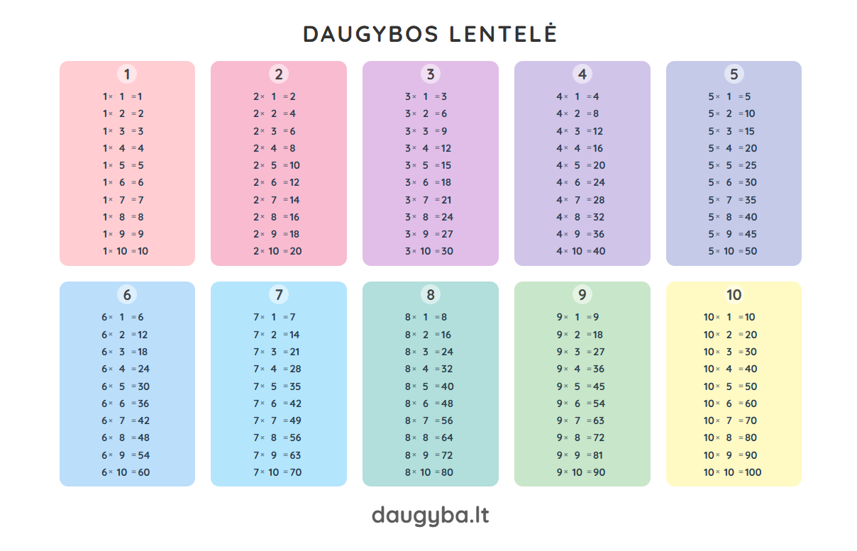 Patarimas: Atsispausdinkite dvi kopijas. Vieną įdėkite į sąsiuvinį, kitą pakabinkite virš darbo stalo. Jei vaikas yra vizualas (geriau įsimena vaizdus), būtinai rinkitės Spalvotą lentelę – skirtingos spalvos padeda atskirti skaičių grupes ir greičiau rasti reikiamą atsakymą.